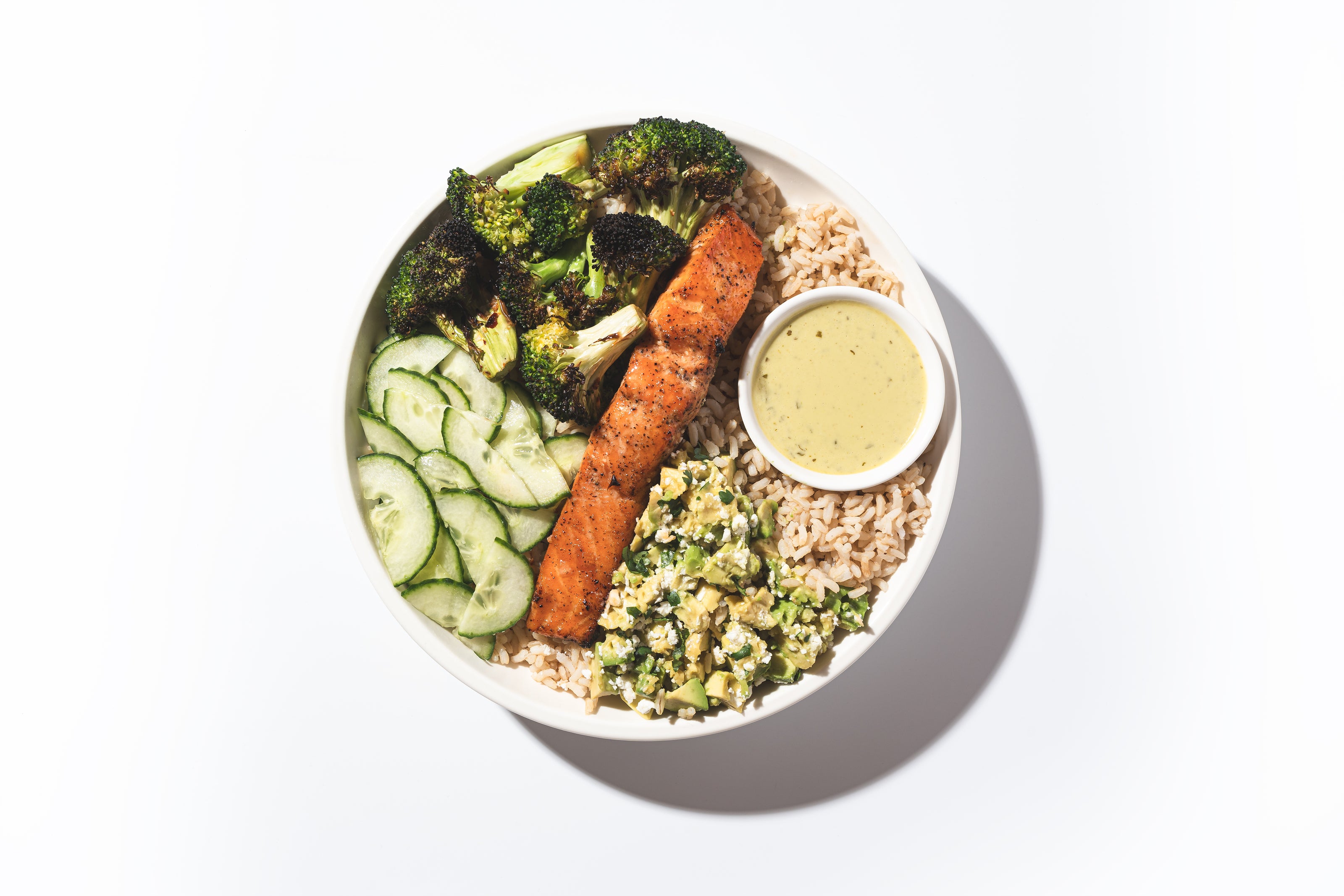 Salmon, Cucumber, Avocado Feta Salsa, Roasted Spicy Broccoli, Basil Ranch