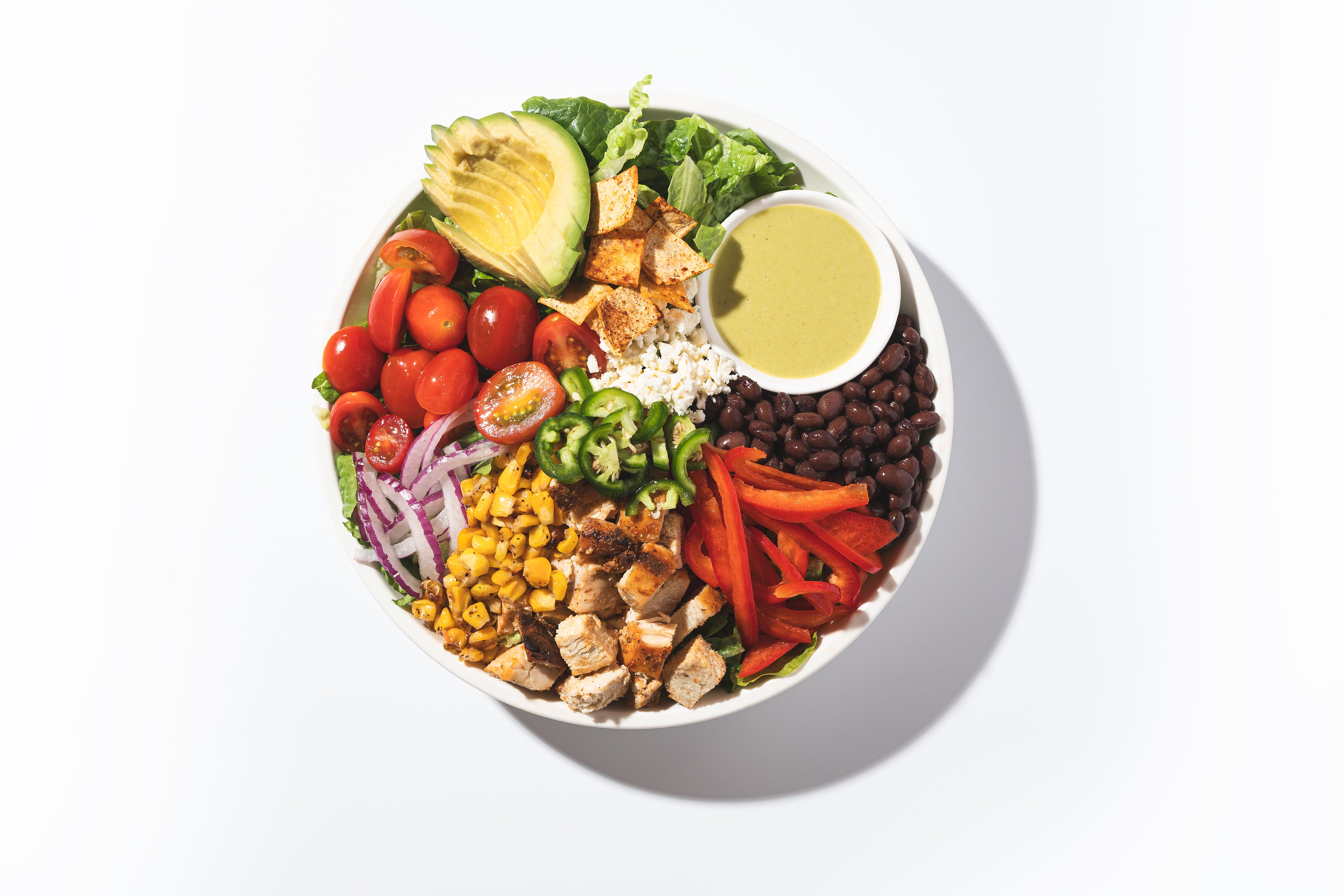 Roasted Chicken, Romaine, Grape Tomato, Roasted Corn, Red Onion, Black Bean, Avocado, Feta Cheese, Jalapeño, FH Chili-Lime Tortilla Strips, Fresh Cilantro, Spicy Margarita Vinaigrette and Chipotle Aioli Drizzle