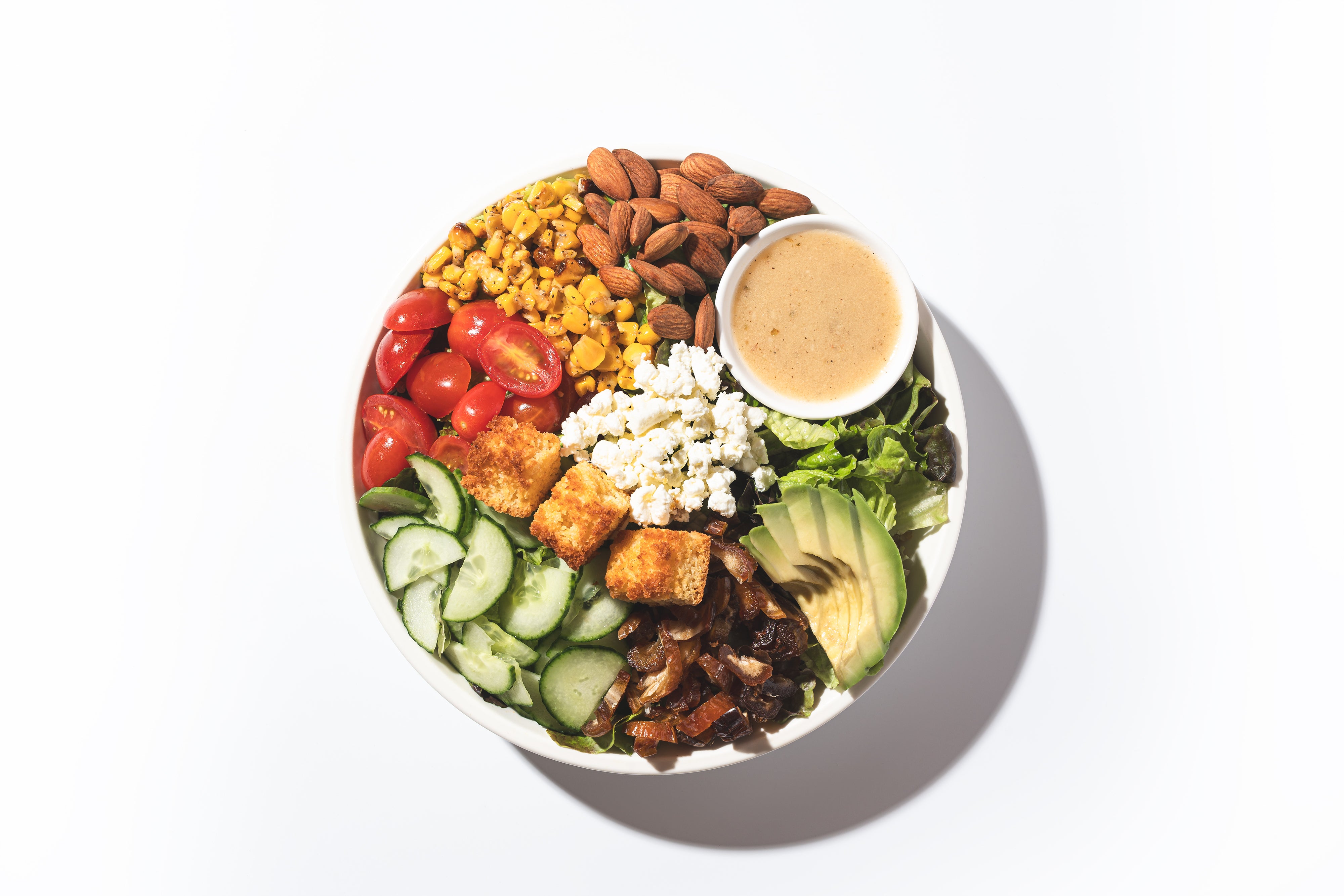 Red Leaf Lettuce, Dates, Roasted Corn, Toasted Almonds, Grape Tomatoes, Avocado, Goat Cheese, FH Cornbread Croutons, Champagne Vinaigrette