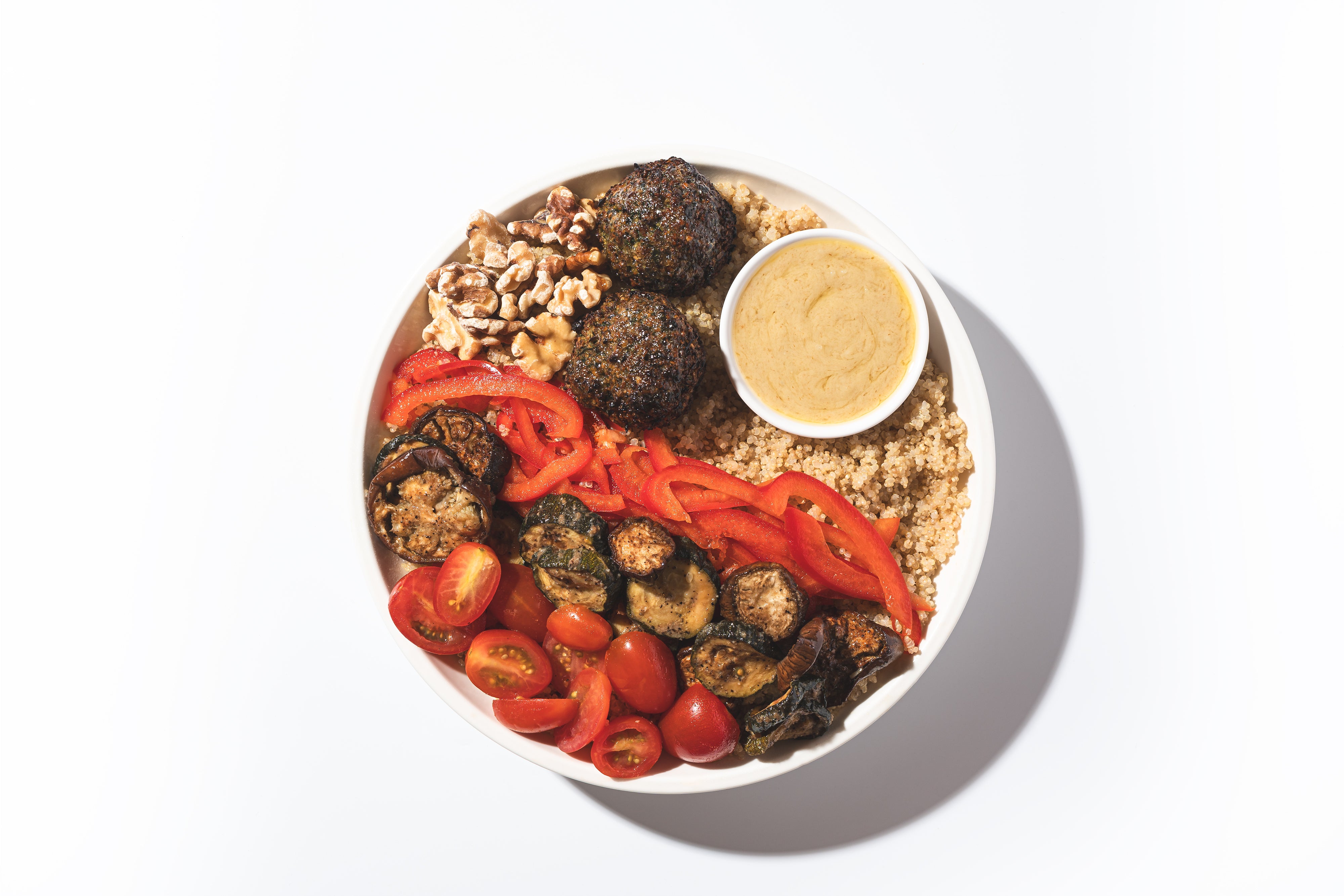 Roasted Eggplant, Roasted Zucchini, Homemade Green Falafel, Red Pepper, Grape Tomatoes, Walnuts, Tahini Dressing