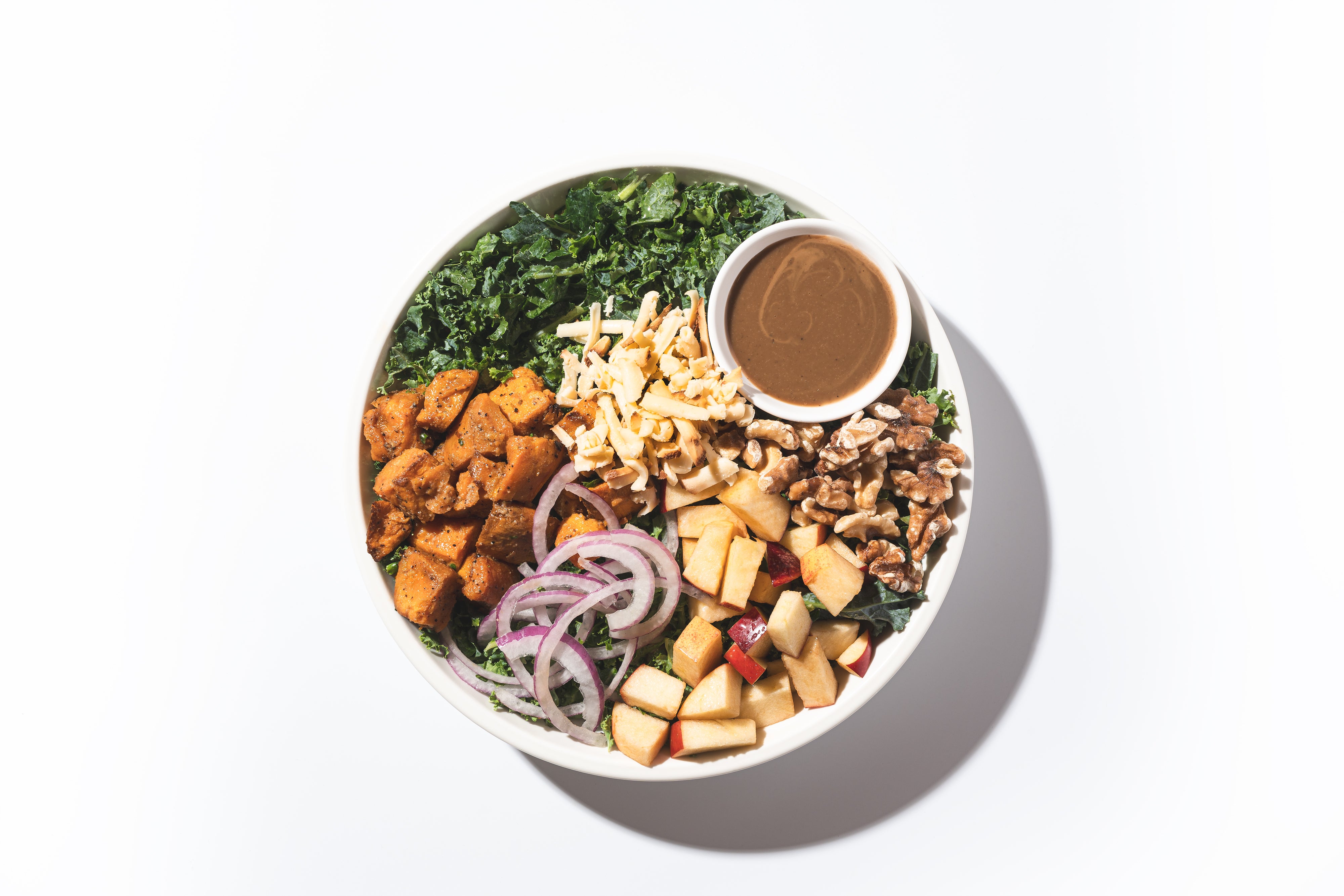 Kale, Quinoa, Red Apples, Roasted Sweet Potatoes, Smoked Gouda, Walnuts, Red Onion, Maple Balsamic Vinaigrette
