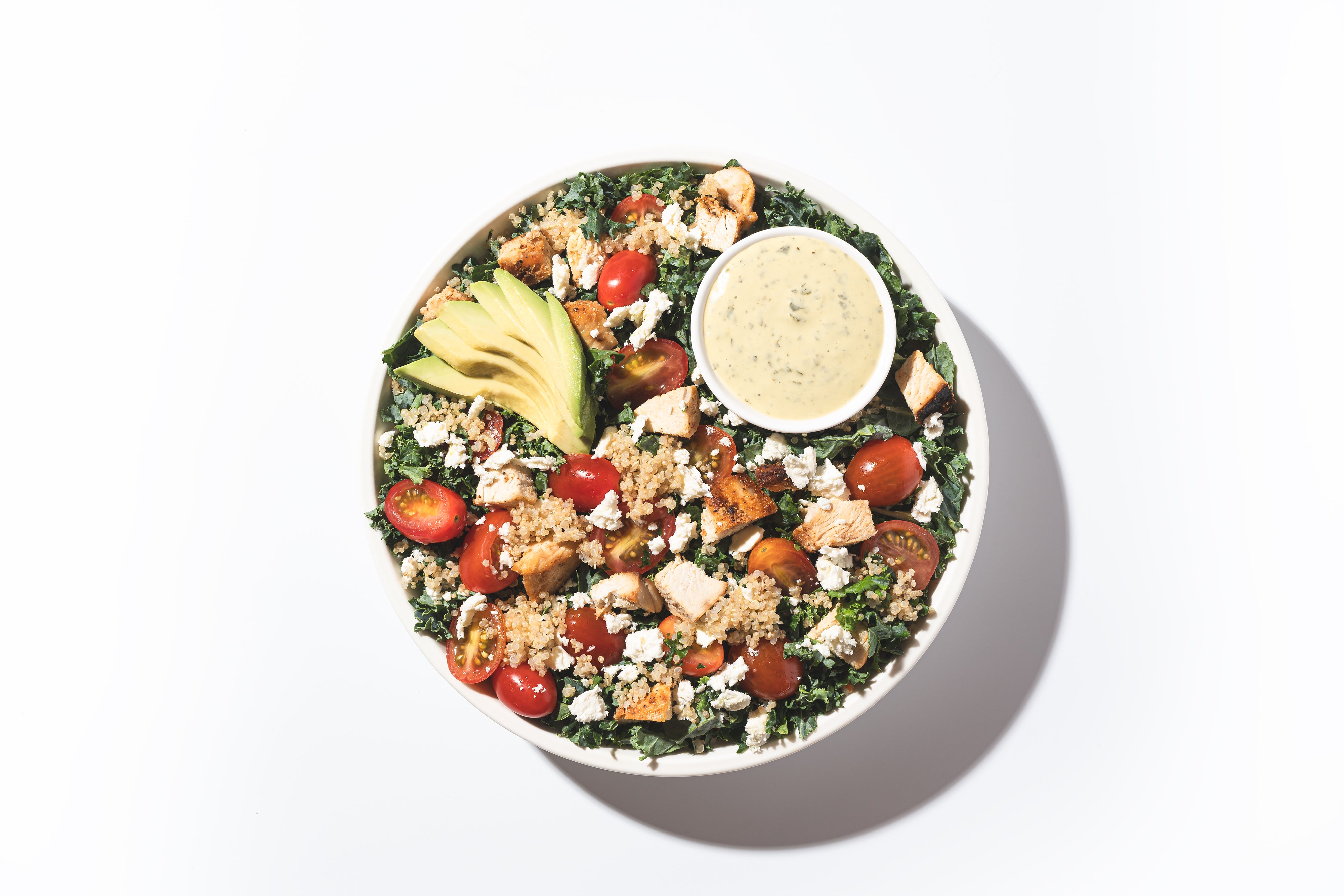 Roasted Chicken, Kale, Quinoa, Avocado, Grape Tomato, Feta Cheese, Matcha Goddess Dressing
