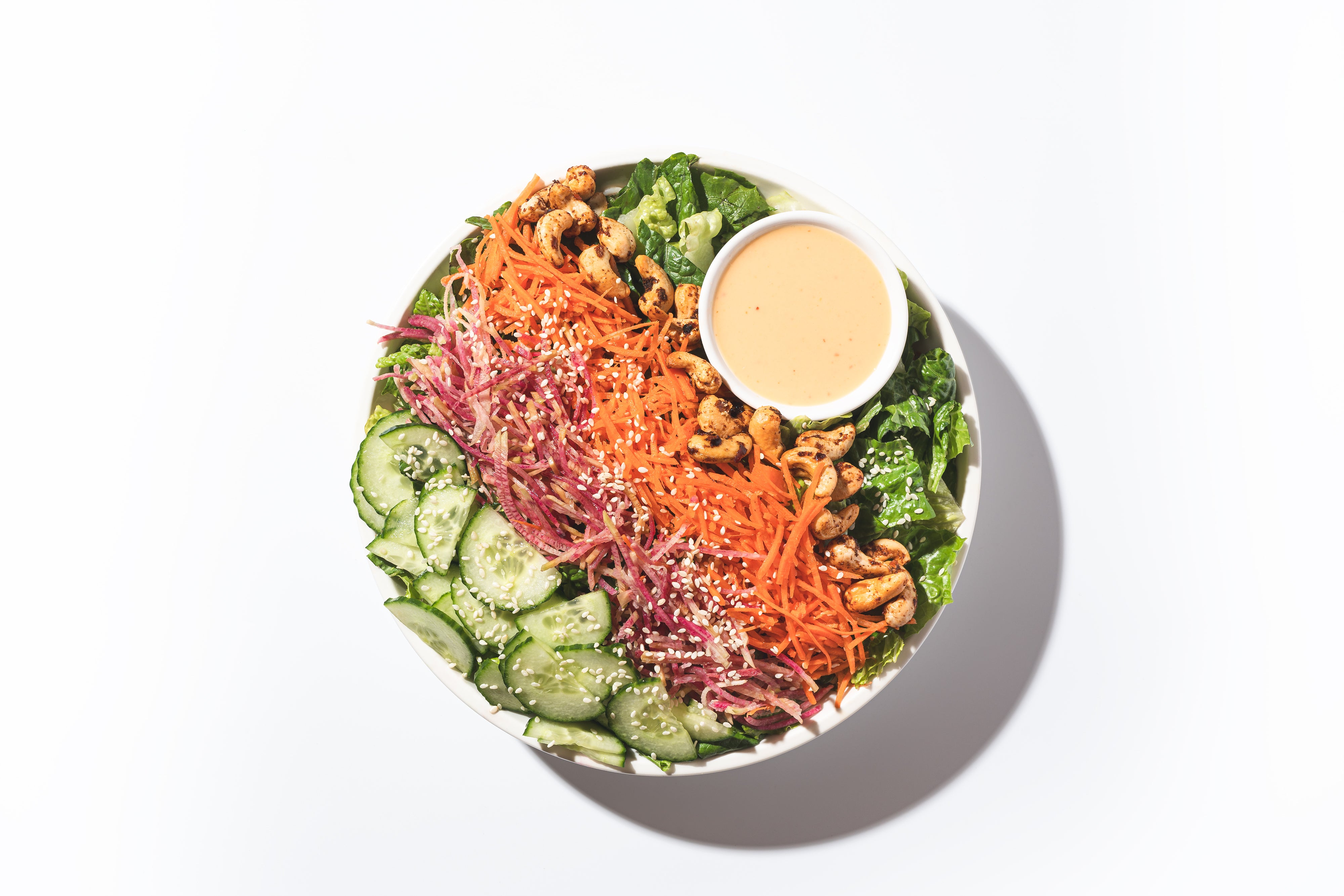 Romaine, Roasted Spicy Cashews, Watermelon Radish, Carrots, Sesame Seeds, Miso Ginger Dressing