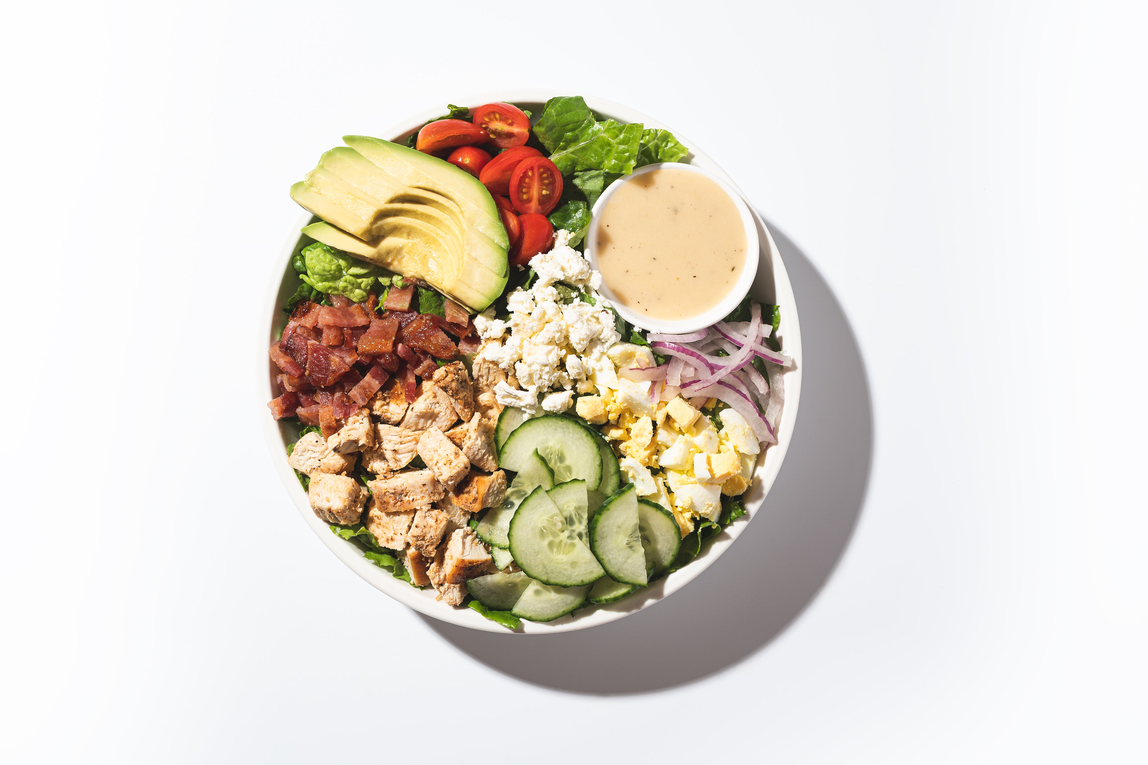 Roasted Chicken, Maple Bacon, Chopped Eggs, Red Onions, Cucumbers, Grape Tomatoes, Avocado, Feta, Truffle Honey Mustard Dressing