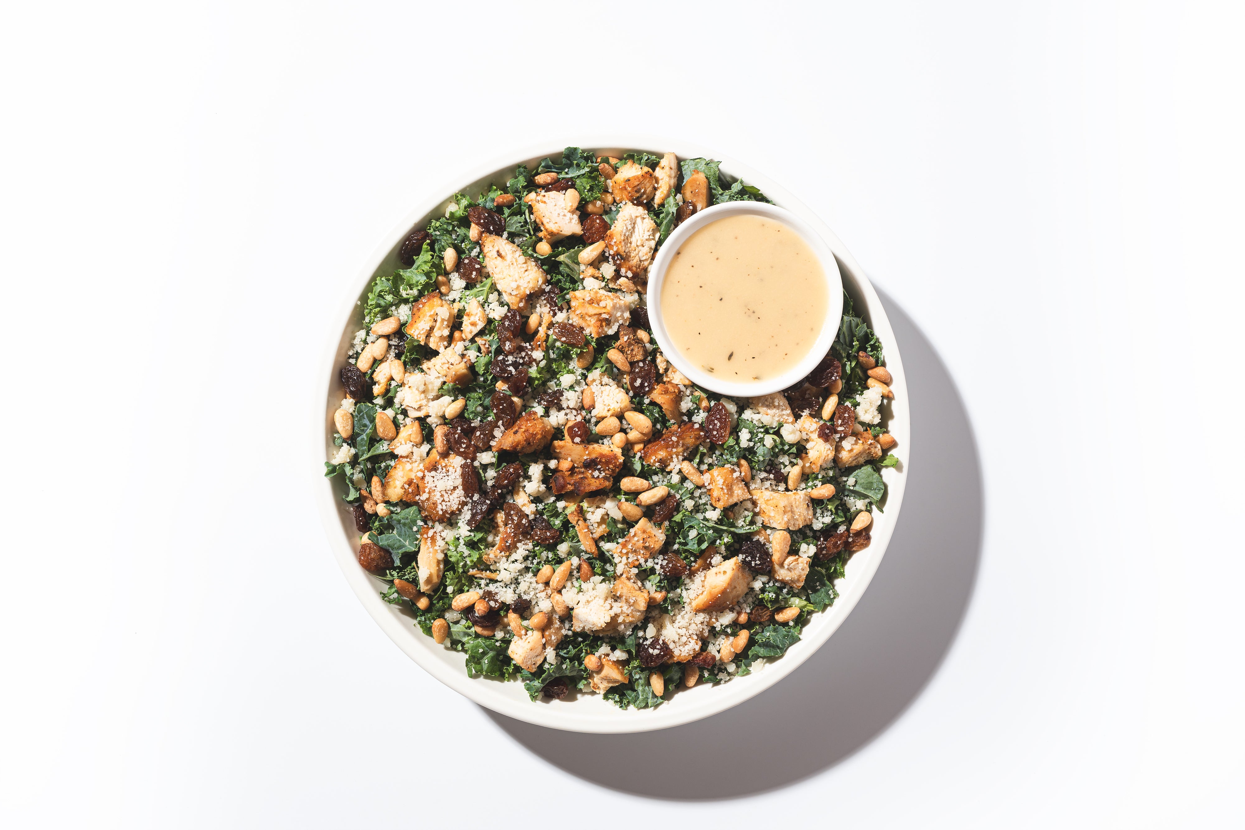 Roasted Chicken, Kale, Parmigiano Reggiano, Golden Raisins, Toasted Breadcrumbs, Toasted Pine Nuts, Lemon Agave Vinaigrette