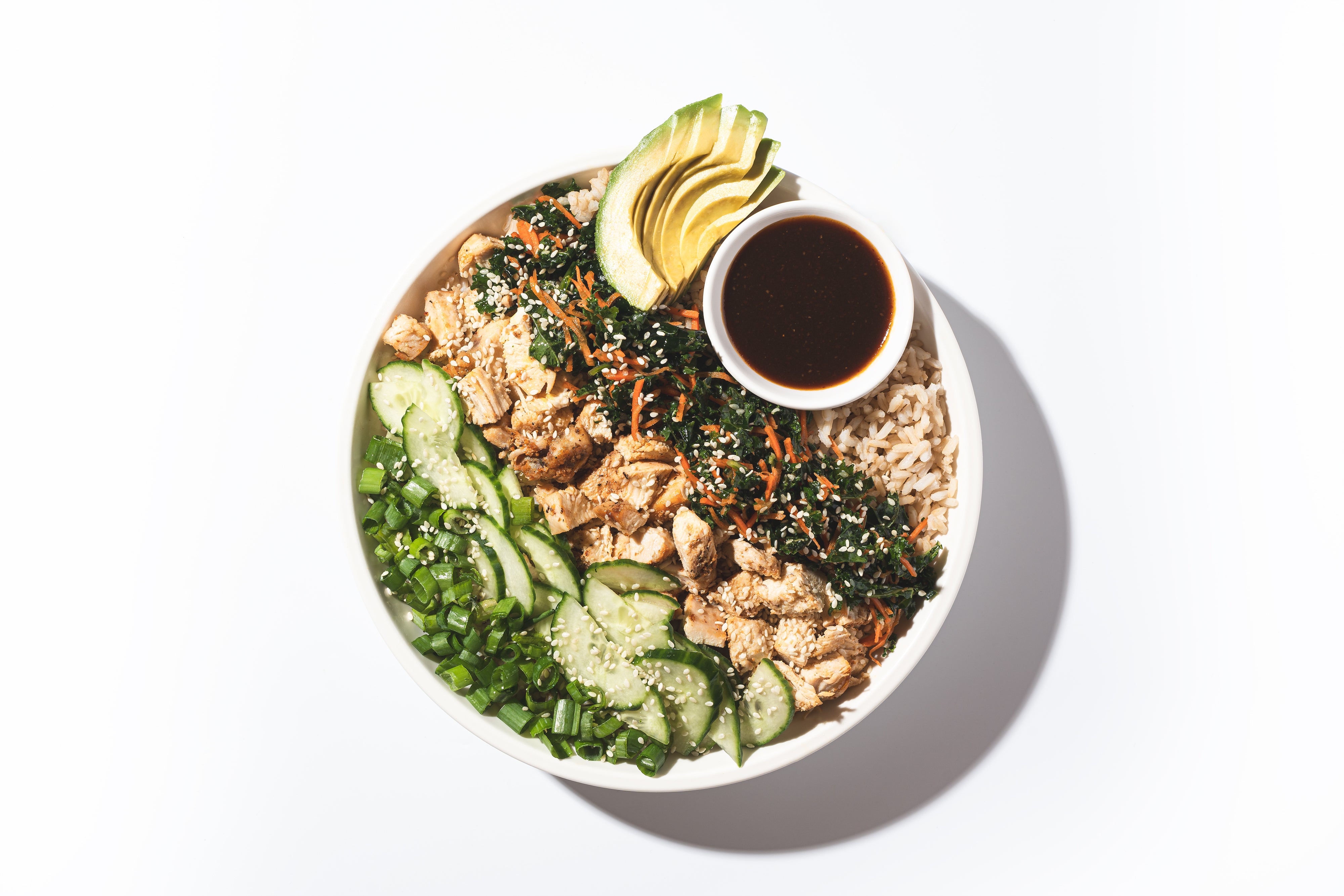 Roasted Chicken, Kale & Carrot Sesame Slaw, Cucumbers, Avocado, Green Onion, Sesame Seeds, FH Teriyaki Sauce