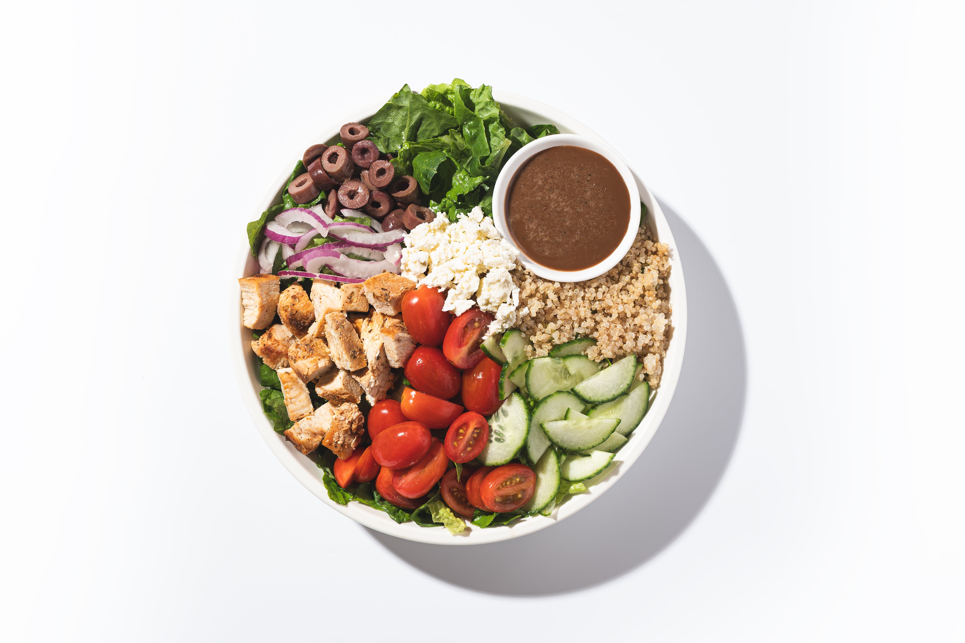 Roasted Chicken, Romaine, Quinoa, Feta, Red Onion, Cucumber, Kalamata Olives, Grape Tomatoes, Balsamic Vinaigrette