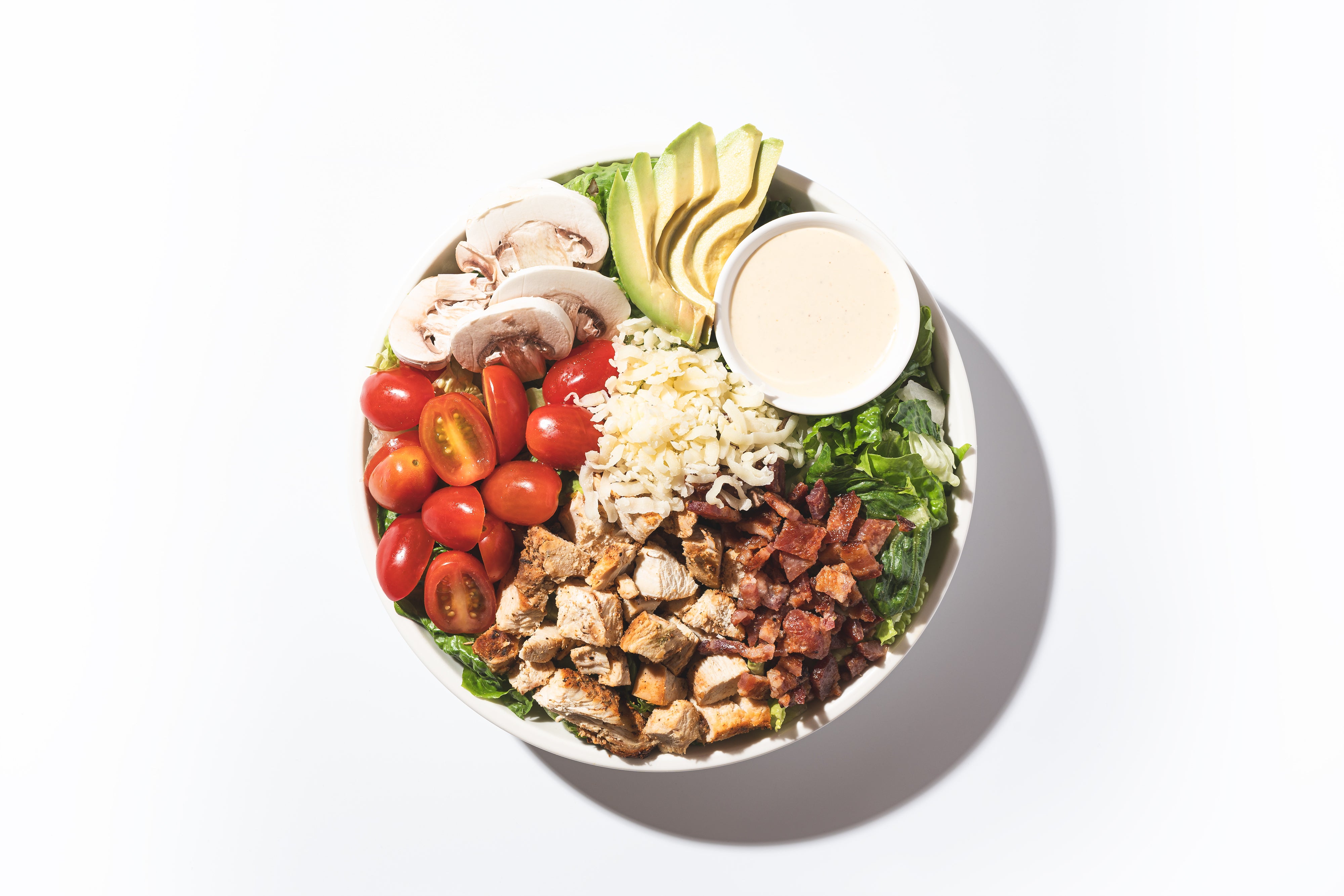 Roasted Chicken, Romaine, Maple Bacon, Avocado, Grape Tomato, Mushrooms, Farmhouse Caesar Dressing